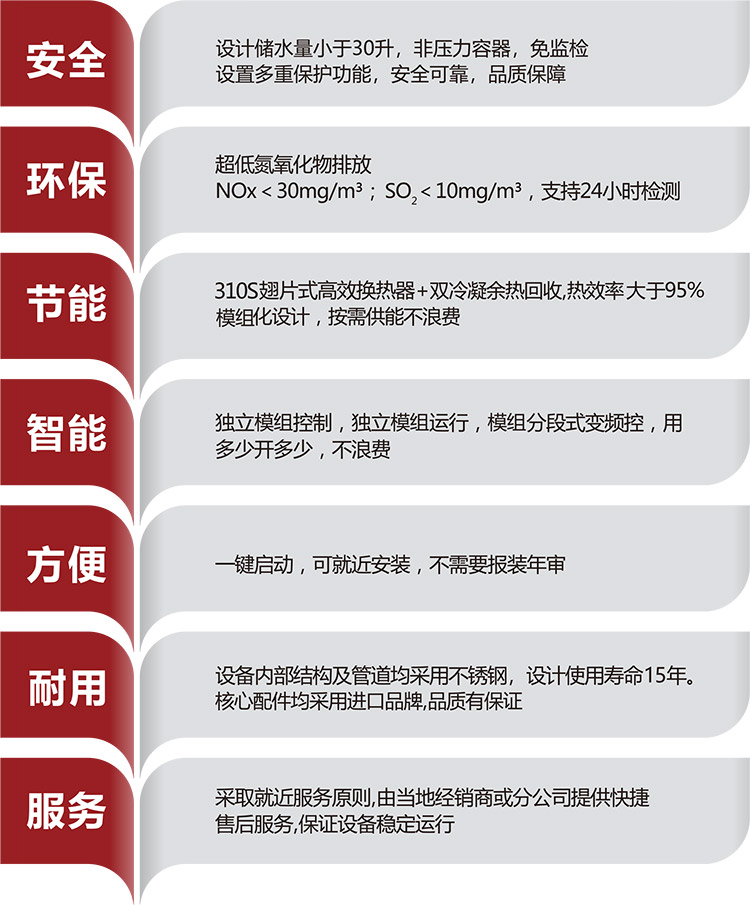 6、綠色環(huán)保,使用清潔天然氣或液化氣作為主要能源,排放遠(yuǎn)低于國家規(guī)定排放標(biāo)準(zhǔn),有益于環(huán)境保護。